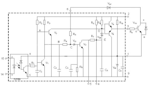 圖1為EXB841的驅動原理[4,5]。其主要有三個工作過程:正常開通過程、正常關斷過程和過流保護動作過程。14和15兩腳間外加PWM控製信號,當觸發脈衝信號施加於14和15引腳時,在GE兩端產生約16V的IGBT開通電壓;當觸發控製脈衝撤銷時,在GE兩端產生-5.1V的IGBT關斷電壓。過流保護動作過程是根據IGBT的CE極間電壓Uce的大小判定是否過流而進行保護的,Uce由二極管Vd7檢測。當IGBT開通時,若發生負載短路等發生大電流的故障,Uce會上升很多,使得Vd7截止,EXB841的6腳“懸空”,B點和C點電位開始由約6V上升,當上升至13V時,Vz1被擊穿,V3導通,C4通過R7和V3放電,E點的電壓逐漸下降,V6導通,從而使IGBT的GE間電壓Uce下降,實現軟關斷,完成EXB841對IGBT的保護。射極電位為-5.1V,由EXB841內部的穩壓二極管Vz2決定。