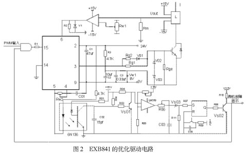 如圖2所示,用外接8V穩壓管Vw1代替驅動芯片內部的穩壓管Vz2,在穩壓管兩端並聯了兩個電容值分別為105μf和0.33μf的去耦濾波電容。為防止柵極驅動電路出現高壓尖峰,在柵射極間並聯了反向串聯的16V(V02)和8V(V03)穩壓二極管。為了改善控製脈衝的前後沿陡度和防止震蕩,減小IGBT 集電極的電壓尖脈衝,需要在柵極串聯電阻Rg。柵極串連電阻Rg要恰當,Rg過小,關斷時間過短,關斷時產生的集電極尖峰電壓過高;Rg過大,器件的開關速度降低,開關損耗增大。優化電路采用了不對稱的開啟和關斷方法。在IGBT開通時,EXB841的3腳提供+16V的電壓,電阻Rg2經二極管Vd1和Rg1並聯使Rg值較小。關斷時,EXB841內部的V5導通,3腳電平為0,優化驅動電路在IGBT的E極提供-8V電壓,使二極管V01截止,Rg= Rg1具有較大值。並在柵射極間並聯大電阻,防止器件誤導通。