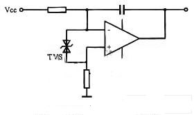 集ji成cheng運yun放fang對dui外wai界jie電dian應ying力li非fei常chang敏min感gan。因yin此ci,在zai使shi用yong運yun放fang的de過guo程cheng中zhong,如ru果guo因yin操cao作zuo失shi誤wu或huo采cai取qu了le不bu正zheng常chang的de工gong作zuo條tiao件jian,往wang往wang會hui出chu現xian過guo大da的de電dian壓ya或huo電dian流liu,特te別bie是shi浪lang湧yong和he靜jing電dian脈mai衝chong,從cong而er很hen容rong易yi使shi運yun放fang受shou損sun或huo失shi效xiao。圖tu5所示是用TVS在運放差模輸入端防止過壓損傷的保護電路。