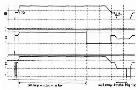 過充電保護:在充電過程中,當電池電壓高於過充電檢測電壓,且該狀態持續到過充電檢測延遲時間後,控製電路輸出一個低電平,關斷充電控製用FET2,禁止充電。
