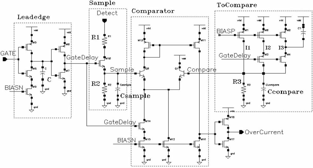 比較電壓產生器的電路工作原理如下:由於過流狀態隻發生在功率LDMOS 管柵極為高電平狀態。故當V(GATEDelayed)為低電平時,I1、I2和I3將同時對電容Ccompare充電, 使比較電壓V(Compare) 值升高。考慮到采樣電壓最大值為2.5V,為避免誤操作,可設置比較電壓值為2.7 V,以使後繼比較電路工作的門限電平增加,提高抗幹擾能力;與此同時,采樣電容CsAMPle將通過電阻R2快速放電,使采樣電壓V(Sample)快速變為零,即相應輸出為非過流狀態。