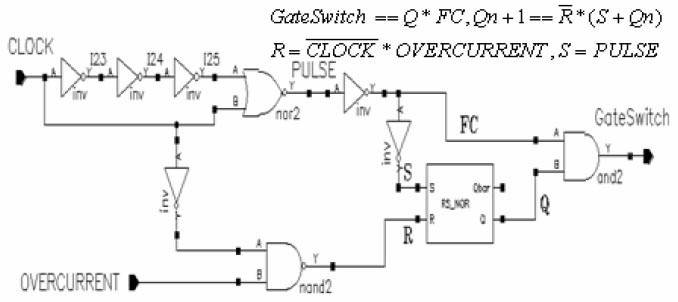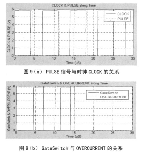控製邏輯模塊如圖4 所示,該模塊直接控製LDMOS 的開關。PULSE 信號的上升沿對應是CLOCK 時鍾的開始,PULSE 信號與時鍾CLOCK 的關係如圖9 所示。當發生過流時,OVERCURRENT信號為低,觸發器R 端為高,Q 為低,GateSwitch 信號為低,關斷LDMOS,從而實現過流保護功能。