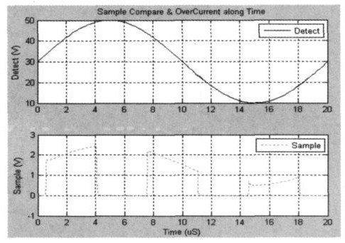 設檢測端電壓一般在10~50 V 之間變化,我們設置V(Detect)=SIN(30,20,50 k);周期為20μS;又設在采樣周期內,比較電壓為1 V;依據LDMOS管導通特性,設輸出漏電壓高於某值(本例為20伏)為過流,則分壓比設計為K = R4/ ( R3+R4)=5 k/(5 k+95 k)=1/20, 於是得到采樣電壓值為V(Sample)=V(Detect)*k =SIN(1.5,1,50 k),即最大值為2.5,最小值為0.5。同樣地,我們在采樣電路輸出端加上一個電容以消除電壓尖峰影響。該采樣電路仿真結果如圖6 所示。