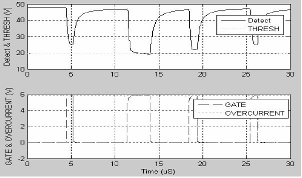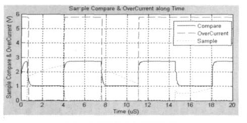 對圖3 進行電路仿真,電源電壓VCC 為5.8 V,LDMOS 漏端檢測電壓在10~50 V 之間,柵端電壓脈衝頻率為132 kHz,占空比為60%的方波,SPICE仿真條件設置為VCC=5.8 V,V (Detect)= SIN(30,20,50k),V (Gate)=PULSE(0,5.8,0.5u,0.5u,0.5u,3u,7u),仿真結果如圖8 所示。在1.26 uS~4.17 uS 和8.25 uS~11.2 uS 這兩個采樣區間內,采樣電壓V(Sample)較比較電壓V(Compare)大,輸出為低電平(過流保護,低電平有效);在15.2 uS~18.2 uS 采樣區間內,采樣電壓V (Sample) 較比較電壓V(Compare)小,輸出為高電平,對應不發生過流情況;其他時間段內柵電壓處於低電平,對應LDMOS處於關斷態,不可能發生過流,故過流輸出信號OverCurrent 為高電平。仿真結果表明,該電路確實能很好地實現過流保護的功能。