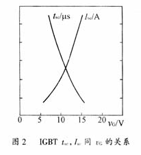IGBT的短路電流和柵壓有密切關係,柵壓越高,短路時電流就越大。在短路或瞬態過流情況下若能在瞬間將vGS分步減少或斜坡減少,這樣短路電流便會減小下來,當IGBT關斷時,di/dt也減小。集成驅動電路如EXB841或M579xx係列都有檢測vCES電路,當發現欠飽和時,柵壓箝位到10V左右,增大vCES,限製過電流幅值,延長允許過流時間。短路允許時間tsc和短路電流Isc同柵極電壓vG的關係如圖2所示。