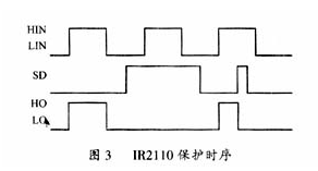 本設計逆變器為半橋式結構,串聯諧振負載,驅動采用IR公司的IR2110半橋驅動芯片。IR2110電路簡單,成本低,適用於中大功率IGBT,實驗結果也驗證了IR2110驅動中大功率IGBT的可行性。IR2110芯片有一個封鎖兩路驅動的SD輸入端,當此引腳為高電平時,立刻封鎖兩路輸出,如圖3所示。