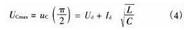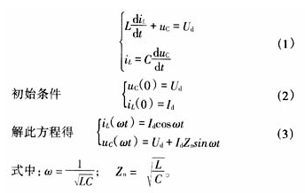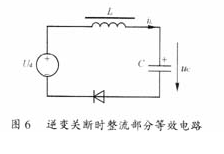假設逆變關斷時濾波電感中的電流全部從電容C中流過,同時整流器繼續輸出電壓Ud。圖6給出了等效電路,L與C串聯諧振,由於整流橋電流隻能單向流通,所以振蕩到T/4時結束。