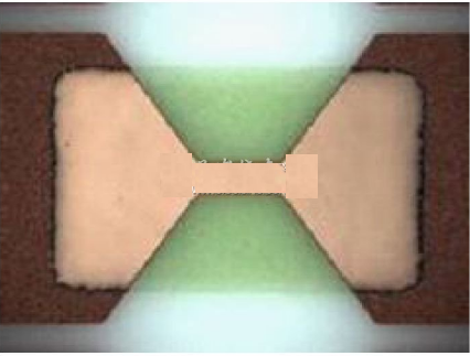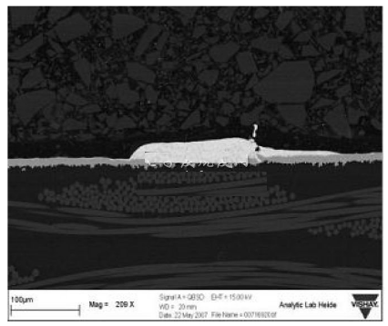 厚膜電阻的使用經驗表明,短時過載、焊han接jie熱re等deng熱re應ying力li和he脈mai衝chong應ying力li會hui使shi阻zu值zhi發fa生sheng漂piao移yi。這zhe些xie在zai貼tie片pian式shi保bao險xian絲si裏li發fa生sheng的de現xian象xiang將jiang會hui改gai變bian保bao險xian絲si的de特te性xing,進jin而er縮suo短duan熔rong斷duan時shi間jian。雖sui然ran熔rong體ti使shi用yong了le幾ji種zhong不bu同tong的de材cai料liao,例li如ru銅tong錫xi合he金jin,可ke以yi達da到dao高gao水shui平ping的deI2T,但在持續的熱應力之後,熔體對斷開時間的縮短是非常敏感的。這是由於應力會導致熔體組成材料的遷移,如圖2所示,該圖顯示了在施加脈衝負載應力之後,銅錫合金正在發生遷移的情況。