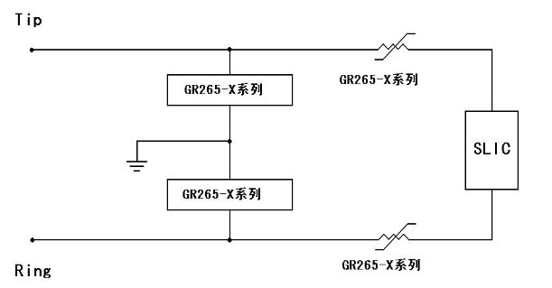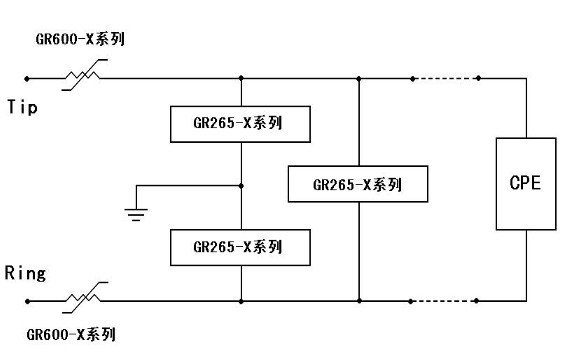 目前本公生產的GR265-X和GR600-X 等係列高分子PTC 熱re敏min電dian阻zu和he半ban導dao體ti固gu體ti放fang電dian管guan一yi起qi用yong於yu總zong配pei線xian架jia的de保bao安an單dan元yuan中zhong,可ke以yi滿man足zu過guo流liu和he過guo壓ya保bao護hu的de要yao求qiu,同tong時shi幫bang助zhu保bao安an單dan元yuan滿man足zu中zhong國guo通tong信xin行xing業ye標biao準zhun YD/T 694-1999-2002、北美 TelcordiaGR-974 及 ITU-T K.20 等標準,典型的使用電路如上圖所示。