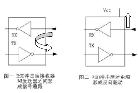 ESD 還會引起IC的死鎖LATCHUP 這種效應和CMOS 器件內部的類似可控矽的結構單元被激活有關高電壓可激活這些結構形成大電流通道一般是從VCC 到地串行接口器件的鎖死電流可高達1 安培鎖死電流會一直保持直到器件被斷電不過到那時IC 通常早已因過熱而燒毀了ESD衝擊後可能存在兩個不易被發現的問題一般用戶和IEC測試機構使用傳統的環路反饋方法和插入方法進行測試通常檢測不出這兩個問題。