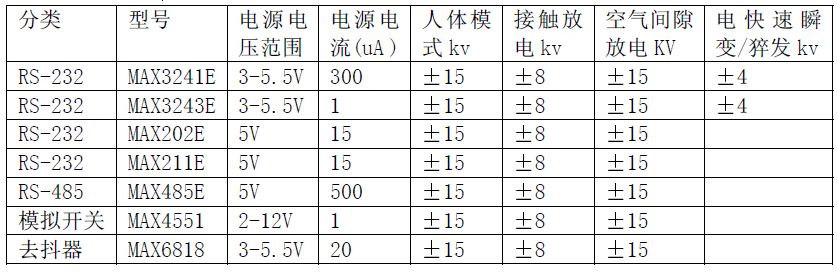 收的COM 端口需要8 個TransZorb二極管費用高達$2一種有效的方法是采用內部集成ESD 防護功能的串行接口器件這種器件比普通無防護功能的器件價格要貴但增加的費用比起外加防護二極管的費用要低內部集成的ESD,防護電路不會增加任何輸入輸出管腳的等效電容也節省了電路板麵積MAXIM公司近幾年發展了享有專利的集成ESD防護技術並可提供全係列的ESD防護串行接口器件包括與標準器件完全兼容的產品MAXIM公司還將同樣的技術應用到模擬開關和開關去抖產品中所有這些器件的ESD 防護能力都符合15kV IEC1000-4-2 氣隙放電8kVIEC1000-4-2 接觸放電15kV人體模型HBM 測試標準下表是MAXIM公司具有抗靜電功能的器件。