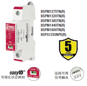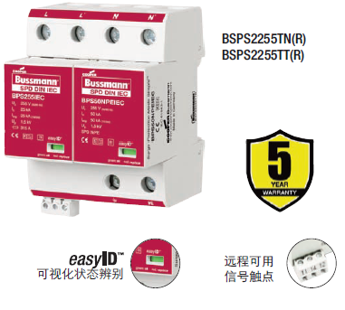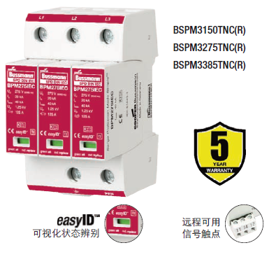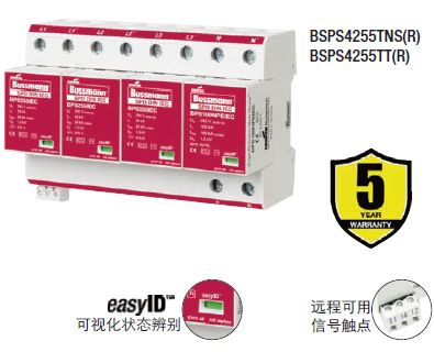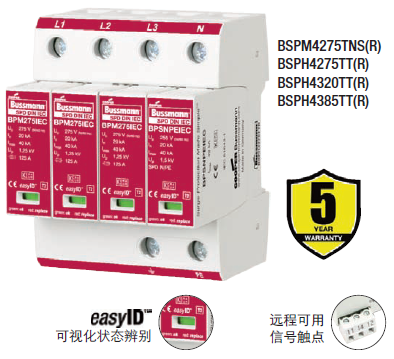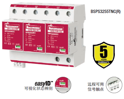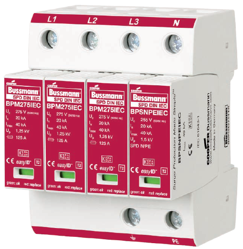 Cooper Bussmann IEC I級230伏、三極、結合了雷電流和浪湧保護器的模塊具有兩個特色:局部的、easyIDTM可視化辨別