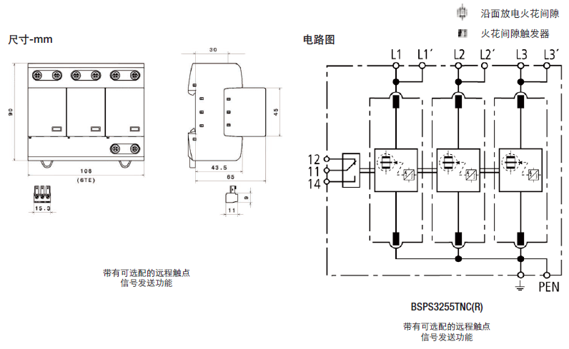 • 由於采用了耐用的氧化鋅變阻器和火花間隙技術,具有很高的浪湧 放電容量