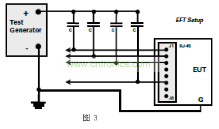 檢查設備的 EFT 免疫力(根據 IEC61000-4-4 標準),與共模雷擊浪湧測試非常相似。在如圖 3 所示比較典型的配置中,所有的導體(或引腳)電容耦合到測試信號發生器的正極和“浪湧”到 GND。如果數據線幾乎沒有差別,線對之間很少有異模能量,但變壓器耦合電容會再次將共模能量以衰減的方式傳輸到驅動端。