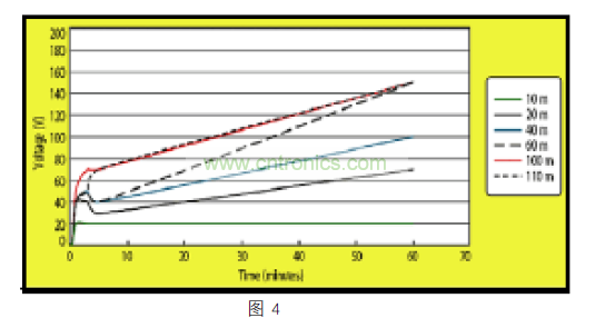 suizhierlaidegaonengliangfangdiankenenghuisunhuailianjieqi,bianyaqidianlu,huoyitaiwangshoufaqi。shuangjiaoxiandianlanbiaoxianxiangyigecunchudianhededianrongqi。youyanjiuzhengming,weilianjiedaozhongduandeshuangjiaoxiandianlankenenghuijileijibaifudedianhe。ciwai,zaiyigexiaoshinei,wanquanfangdiandedianlankeyijileiqisuonengjileizongdianhedeyiban。yidanyoulejingdian,gaopinzhidedianlanbaoliuqisuodaijingdiandeshijiankeyichaoguo 24 小時。下麵圖 4展示了不同長度的 CAT5 電纜積累靜電如何隨著時間而變化。由於較長的電纜有容量來存儲更多的電荷,電纜長度超過 60m 的係統應采取額外的 CDE 預防措施。