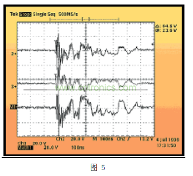 另一個要了解的重要因素是 CDE boxing,yinweitabuxiangyiqiantaolunderenheweixie,qujueyuouhejizhi,yaomeshiyimo,yaomeshigongmo。ciwai,chubuyanjiuxianshi,tazaitedianshangyouhendachayi,danzongtishangkan,CDE 的波形能量高,體現在電壓和電流驅動上。波形傳播的時間為幾百納秒,能夠快速反轉極性。下麵的圖 5,給出了破壞性 CDE 波形的例子,在一個以太網 PHY 發射器引腳,一個 25 英尺雙絞線電纜靜電電壓達 1.5KV。在該事件發生超過 600ns 時間的期間,在異模波形上看到有 64.8V 從正電壓轉換為負電壓。在這個實驗中,PHY 的發射器被破壞,無法在網絡上傳輸數據包。