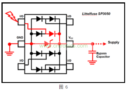通過連接 SP3050的 VCC 引腳,由於電氣瞬態兩個獨立的放電路徑,如下(圖 6)hongsesuoshi,shejizhejianggenghaojinxingjiajinsheji。keyijiandandijiangtakanzuoyigedianzufenyaqi,qizhongshuntaidianliutongguodaoxiangerjiguan,bingxuanzeleliangtiaolu,yigetongguoneibu TVS到 GND,一個通過電源或外部旁路電容到 GND。總而言之,第 5 腳連接到電源,將導致更好的夾緊性能,給以太網 PHY 提供更好的整體保護。