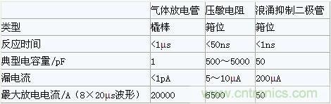 各(ge)種(zhong)浪(lang)湧(yong)抑(yi)製(zhi)器(qi)件(jian)的(de)共(gong)同(tong)特(te)點(dian)為(wei)器(qi)件(jian)在(zai)閾(yu)值(zhi)電(dian)壓(ya)以(yi)下(xia)都(dou)呈(cheng)現(xian)高(gao)阻(zu)抗(kang),一(yi)旦(dan)超(chao)過(guo)閾(yu)值(zhi)電(dian)壓(ya),則(ze)阻(zu)抗(kang)便(bian)急(ji)劇(ju)下(xia)降(jiang),都(dou)對(dui)尖(jian)峰(feng)電(dian)壓(ya)有(you)一(yi)定(ding)的(de)抑(yi)製(zhi)作(zuo)用(yong)。但(dan)各(ge)自(zi)都(dou)有(you)缺(que)點(dian),因此根據具體的應用場合,一般采用上述器件中的一個或者幾個的組合來組建相應的保護電路。各種浪湧抑製器件的參數對比見表1所列。