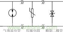 2)氣體放電管和壓敏電阻組合構成的抑製電路