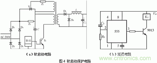 開關穩壓電源的電路比較複雜,開關穩壓器的輸入端一般接有小電感、大(da)電(dian)容(rong)的(de)輸(shu)入(ru)濾(lv)波(bo)器(qi)。在(zai)開(kai)機(ji)瞬(shun)間(jian),濾(lv)波(bo)電(dian)容(rong)器(qi)會(hui)流(liu)過(guo)很(hen)大(da)的(de)浪(lang)湧(yong)電(dian)流(liu),這(zhe)個(ge)浪(lang)湧(yong)電(dian)流(liu)可(ke)以(yi)為(wei)正(zheng)常(chang)輸(shu)入(ru)電(dian)流(liu)的(de)數(shu)倍(bei)。這(zhe)樣(yang)大(da)的(de)浪(lang)湧(yong)電(dian)流(liu)會(hui)使(shi)普(pu)通(tong)電(dian)源(yuan)開(kai)關(guan)的(de)觸(chu)點(dian)或(huo)繼(ji)電(dian)器(qi)的(de)觸(chu)點(dian)熔(rong)化(hua),並(bing)使(shi)輸(shu)入(ru)保(bao)險(xian)絲(si)熔(rong)斷(duan)。另(ling)外(wai),浪(lang)湧(yong)電(dian)流(liu)也(ye)會(hui)損(sun)害(hai)電(dian)容(rong)器(qi),使之壽命縮短,過早損壞。為此,開機時應該接入一個限流電阻,通過這個限流電阻來對電容器充電。為了不使該限流電阻消耗過多的功率,以致影響開關穩壓器的正常工作,而在開機暫態過程結束後,用一個繼電器自動短接它,使直流電源直接對開關穩壓器供電,這種電路稱之謂直流開關電源的 “ 軟啟動 ” 電路。如圖 4 ( a )所示在電源接通瞬間,輸入電壓經整流橋( D1 ~ D4 )和限流電阻 R1 對電容器 C 充電,限製浪湧電流。當電容器 C 充電到約 80 %額定電壓時,逆變器正常工作.經主變壓器輔助繞組產生晶閘管的觸發信號,使晶閘管導通並短路限流電阻 R1,開關電源處於正常運行狀態.為了提高延遲時間的準確性及防止繼電器動作抖動振蕩,延遲電路可采用圖 4 ( b )所示電路替代 RC 延遲電路.。