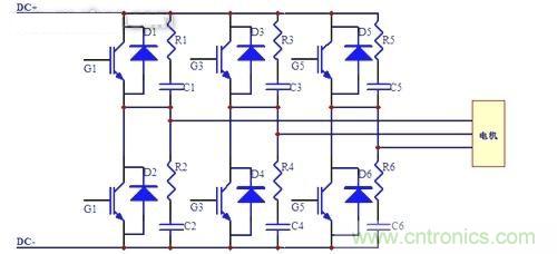在集電極和發射極之間並接RC濾波電路,可有效地抑製關斷過電壓和開關損耗。但在實際應用中,由於DC電源前端的浪湧突波會使集電極過電壓,並使RC濾波電路部分的抑製效果生效,IGBT通常都會被擊穿或者短路。另外,在電機起動時,由於起動時的大電流,在主線路中分布的電感亦會造成較大程度的感應過電壓,使IGBT損壞。同時,電機勵磁造成的感應電動勢,對電路的破壞也相當地大——工程師們經常沒有考慮到這一點。