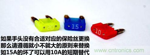 更換保險絲時,一定要選擇正確安培數的保險絲,不要隨意加大保險絲的電流規格,更不能用鐵絲代替。