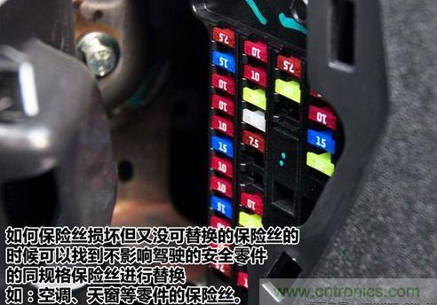 在(zai)沒(mei)有(you)備(bei)用(yong)保(bao)險(xian)絲(si)情(qing)況(kuang)下(xia),緊(jin)急(ji)時(shi),可(ke)以(yi)更(geng)換(huan)對(dui)駕(jia)駛(shi)及(ji)安(an)全(quan)沒(mei)有(you)影(ying)響(xiang)的(de)其(qi)他(ta)設(she)備(bei)上(shang)的(de)保(bao)險(xian)絲(si)代(dai)替(ti)。如(ru)果(guo)不(bu)能(neng)找(zhao)到(dao)具(ju)有(you)相(xiang)同(tong)電(dian)流(liu)負(fu)荷(he)的(de)保(bao)險(xian)絲(si),則(ze)可(ke)采(cai)用(yong)比(bi)原(yuan)保(bao)險(xian)絲(si)額(e)定(ding)電(dian)流(liu)低(di)的(de)代(dai)替(ti)。