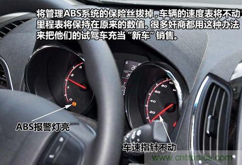 當您新購買車的時候發現車輛的裏程表和車速表不工作時要注意了,因為很可能是奸商把您車輛管理ABS泵的保險絲給拆下來了,這樣車輛還能正常開但裏程數不增加,而這也是很多奸商翻新試駕車後當新車賣的常用手段。