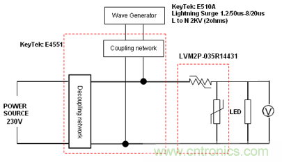 2Pro AC 器件一個常見的應用是 LED 照明,其雷擊的保護要求都小於 2kV surge,2Pro AC 正好可以防護 2kV 的雷擊。下圖是不久前網友調試的一塊客戶 LED 電路板示意圖,雷擊要求是 2kV,把 2Pro AC 放置於 LED lighting 電路輸入端,再加上雷擊波形發生器和交流耦合。