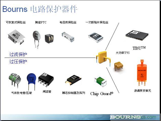 這個是目前我們所有的保護元器件。保護元器件來說,我們主要分為兩塊,一個是過流的,一個是過壓的。過流包括可恢複式保險絲、陶瓷PTC、電信類保險絲、一次斷貼片保險絲。過壓保護的包括氣體放電管/壓敏、閘流管等。另外我們還有大功率TVS、TBU、浪湧保安單元。