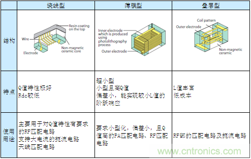 疊層型構造雖有3種結構且Q值也較低,但由於其L值偏差及規格、價格等整體的平衡性較好,因此被廣泛使用於RF的匹配電路、共振電路及扼流電路中。