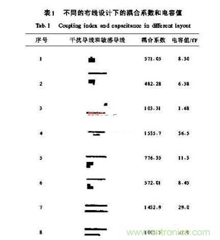 (1)印製板布局時,要將模擬電路區和數字電路區合理地分開,電源和地線單獨引出,電源供給處彙集到一點;PCB布線時,高頻數字信號線要用短線,主要信號線最好集中在PCB板中心,同時電源線盡可能遠離高頻數字信號線或用地線隔開。其次,可以根據耦合係數來布線,盡量減少幹擾耦合。(見表1)