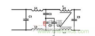 EMI濾波技術是一種抑製尖脈衝幹擾的有效措施,可以濾除多種原因產生的傳導幹擾。圖3是一種由電容、電感組成的EMI濾波器,接在開關電源的輸入端。電路中,C1、C5是高頻旁路電容, 用於濾除兩輸入電源線間的差模幹擾;L1與C2、C4;L2與C3、C4組成共模幹擾濾波環節,用於濾除電源線與地之間非對稱的共模幹擾;L3、L4的初次級匝數相等、極(ji)性(xing)相(xiang)反(fan),交(jiao)流(liu)電(dian)流(liu)在(zai)磁(ci)芯(xin)中(zhong)產(chan)生(sheng)的(de)磁(ci)通(tong)相(xiang)反(fan),因(yin)而(er)可(ke)有(you)效(xiao)地(di)抑(yi)製(zhi)共(gong)模(mo)幹(gan)擾(rao)。測(ce)試(shi)表(biao)明(ming),隻(zhi)要(yao)適(shi)當(dang)選(xuan)擇(ze)元(yuan)器(qi)件(jian)的(de)參(can)數(shu),便(bian)可(ke)較(jiao)好(hao)地(di)抑(yi)製(zhi)開(kai)關(guan)電(dian)源(yuan)產(chan)生(sheng)的(de)傳(chuan)導(dao)幹(gan)擾(rao)。