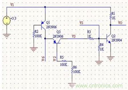 若Q1和Q3基極同時為低時,Q2導通而使得VO為0造成晶振停振關閉處理器。我們分析R3和R4(實際電路470K)使得Q2和Q3處於飽和態;Q3為Q1集電極負載,調整R5阻值時可控製Q1處於飽和態或放大態。要使Q2基極導通必須使Q1提供足夠大電流才滿足條件,隻有Q1處於放大態才滿足條件;