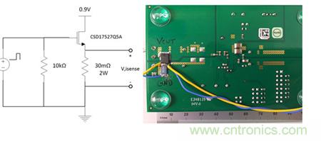 大多數電源評估模塊可以很容易地被配置為快速汲入電流的模式。圖1舉例說明了分立金屬氧化物半導體場效應晶體管(MOSFET)加可直接從輸出平麵焊接到接地裝置的檢測電阻器電路。選擇快速切換的低柵極電荷MOSFET以及能處理負載功率的低電感檢測電阻器至關重要。