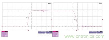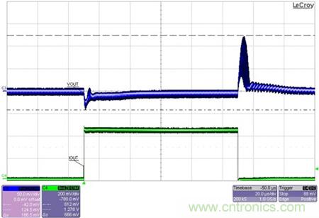 圖3展示了對0.9V輸出(被15A的負載階躍以300A/us的速率擾動)的瞬態響應。