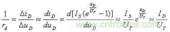 rd是用以Q點為切點的切線斜率的倒數。顯然,Q點在伏安特性上的位置不同,rd的數值將不同。根據二極管的電流方程