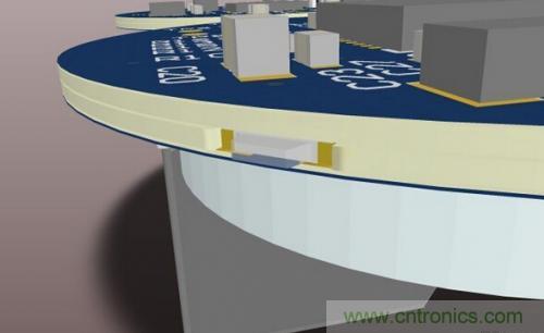為了利用這一功能,Altium Designer 14 (AD14)支持名為Cavity Definition的Region屬性,可以將Height屬性與Region相聯係,允許在任意信號層鋪放元件。為了能夠完全嵌入,元件的凹槽必須延伸至PCB板邊緣,從而在側邊開放,這一點在嵌入貼片LED時尤為重要。如圖2所示,利用Altium Designer 14設計的在圓形PCB板上用於裝配貼片LED的凹槽。