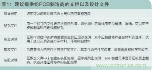在設計嵌入元件時,為了確保成功無誤,重要的一點是與PCB製造商充分的溝通,表1中羅列出了建議提供給PCB製造商的文檔以及設計文件。