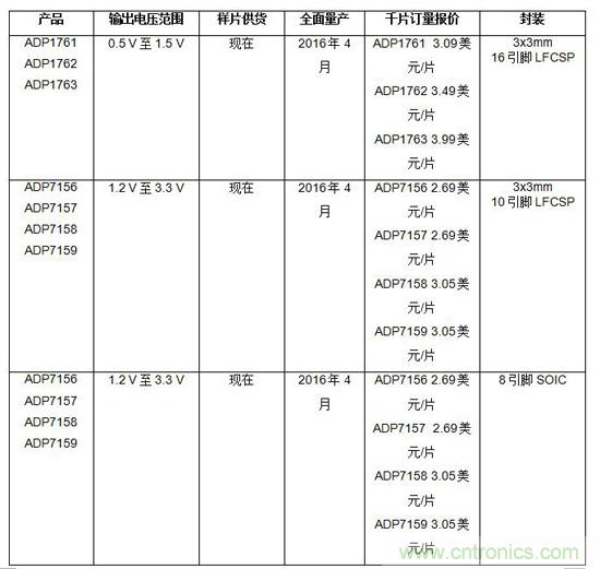 ADP176x和ADP715x LDO具有出色的噪聲和PSRR性能。 ADP176x係列可提供高達3 A的輸出電流,工作輸出電壓範圍為0.5 V至1.5 V。較低的工作電壓輸出組合滿足很多新興應用的高電流內核電軌要求。 ADP715x係列支持1.2 V至3.3 V輸出範圍,具有業界領先的1.6 µVrms性能(10 Hz至100 kHz),同時由於具有超低sub-2 µVrms(100 Hz至100 kHz)性能而將LDO輸出電流範圍從噪聲擴展至最高2 A。 這種超低噪聲和較高的PSRR性能組合為較高的LDO功率電平設立了全新的標杆。