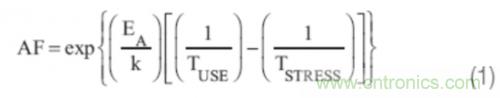 JEDEC和AEC標準均基於健全完善的基本原理,不過技術上比較落後。雖然通過矽產品質量鑒定是一件有價值的、裏程碑式的重大事件,但是用戶需要一個能夠在實際使用條件下,在所需的使用壽命內,比如說10年,以低故障率持續運行的產品。因此,推出FRAM、成比例CMOS、GaN等新技術的公司需要了解這些標準的基本原理。在JEDEC質量鑒定方法體係中,主要的促進要素是溫度。根據方程式eq.(1)計算出加速因子 (AF),在這裏EA是激活能量,而k是玻爾茲曼常數。