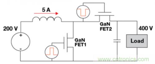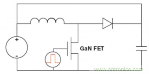 當GaN FET關(guan)閉(bi)時(shi),電(dian)感(gan)器(qi)電(dian)流(liu)通(tong)過(guo)一(yi)個(ge)二(er)極(ji)管(guan)再(zai)次(ci)流(liu)至(zhi)輸(shu)入(ru)端(duan),這(zhe)就(jiu)免(mian)除(chu)了(le)對(dui)負(fu)載(zai)電(dian)阻(zu)器(qi)的(de)需(xu)要(yao),並(bing)且(qie)能(neng)夠(gou)達(da)到(dao)節(jie)能(neng)的(de)目(mu)的(de)。這(zhe)個(ge)單(dan)元(yuan)與(yu)處(chu)於(yu)連(lian)續(xu)電(dian)流(liu)模(mo)式(shi)下(xia)的(de)電(dian)感(gan)器(qi)一(yi)同(tong)運(yun)行(xing)。由(you)於(yu)目(mu)標(biao)是(shi)開(kai)關(guan)變(bian)換(huan),通(tong)過(guo)使(shi)用(yong)短(duan)占(zhan)空(kong)比(bi),可(ke)以(yi)達(da)到(dao)節(jie)能(neng)的(de)目(mu)的(de)。這(zhe)個(ge)元(yuan)件(jian)能(neng)夠(gou)改(gai)變(bian)施(shi)加(jia)的(de)電(dian)壓(ya)、電流、頻率,以及器件所處環境的溫度。額外的漏電流(圖4)由二極管電容提供。