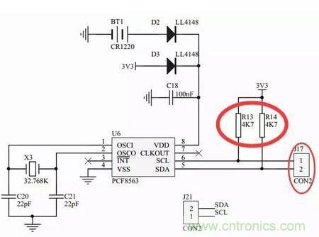 如上圖,R13和R14,一端接到了3.3V,一端通過J17連接到單片機引腳,這兩個電阻就是上拉電阻。