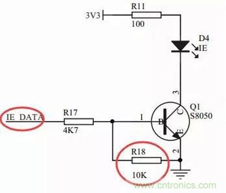 再這麼解釋一下吧,如果IE_DATA那個地方,不連接任何引腳,那麼由於R18的下拉作用,IE_DATA就是低電平,所以三極管就不會導通。