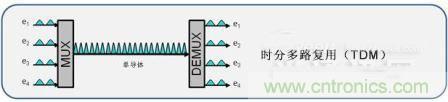 如今有很多這樣的例子,通過使用這種並行電信號,在複用器中組合,並在光纖中串行化傳輸從而實現以太網速率的。例如,10Gbps的以太網有四個通道選項,每個通道占四分之一的速率2.5Gbps。