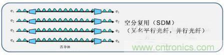 空kong分fen複fu用yong,通tong常chang被bei稱cheng為wei並bing行xing光guang纖xian,是shi一yi種zhong通tong過guo在zai複fu合he鏈lian路lu中zhong增zeng加jia一yi條tiao或huo多duo條tiao光guang纖xian來lai增zeng加jia一yi個ge或huo多duo個ge通tong道dao的de方fang式shi。在zai這zhe種zhong情qing況kuang下xia,一yi個ge通tong道dao實shi際ji上shang就jiu是shi另ling一yi股gu光guang纖xian。這zhe是shi上shang述shu時shi分fen複fu用yong通tong道dao的de一yi個ge替ti代dai方fang案an,在zai時shi分fen複fu用yong中zhong,信xin號hao以yi按an時shi間jian合he並bing在zai同tong一yi條tiao光guang纖xian上shang。行xing業ye中zhong有you很hen多duo應ying用yong這zhe種zhong技ji術shu的de例li子zi。例li如ru,40G SR4通過使用四通道或光纖,在多模光纖上提供40Gbps的速率。也就是在每個方向上有四個通道。這也正是“SR4”中4的含義,4個通道,每個10Gbps。