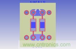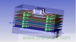 這裏我們以0402的AC耦合電容為例進行仿真,一端Botm層通過換層過孔連接Top麵的AC耦合電容,另外一端通過過孔再連接到Art12層,這裏我們分別仿真3種情況;電容掏空到GND02層,X方向掏34mil,Y方向掏66mil(Case1)。模型建好後的3D效果圖如圖4所示。
