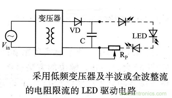 該電路的優點是:電路簡單、成本低。缺點是:體積大、電壓驅動模式,LED亮度會隨著供應電壓的變化而有所改變;無法提供恒流輸出;突波電流較大。這種LED驅動電源的電路結構非常簡單,隻需要一個低頻變壓器、整流器、濾波電容,以及一個用於調整亮度的可變電阻。串聯LED的數目主要由變壓器的匝數比所決定。一旦選用變壓器的匝數比固定之後,若要得到一樣的亮度9就很不容易再改變LED的數目。