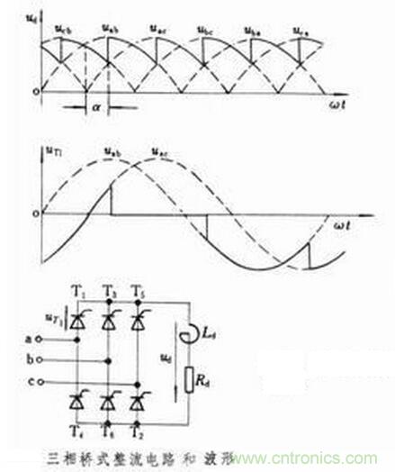 當(dang)整(zheng)流(liu)容(rong)量(liang)較(jiao)大(da),要(yao)求(qiu)直(zhi)流(liu)電(dian)壓(ya)脈(mai)動(dong)較(jiao)小(xiao),對(dui)快(kuai)速(su)性(xing)有(you)特(te)殊(shu)要(yao)求(qiu)的(de)場(chang)合(he),應(ying)考(kao)慮(lv)采(cai)用(yong)三(san)相(xiang)可(ke)控(kong)整(zheng)流(liu)電(dian)路(lu)。這(zhe)是(shi)因(yin)為(wei)三(san)相(xiang)整(zheng)流(liu)裝(zhuang)置(zhi)三(san)相(xiang)是(shi)平(ping)衡(heng)的(de),輸(shu)出(chu)的(de)直(zhi)流(liu)電(dian)壓(ya)和(he)電(dian)流(liu)脈(mai)動(dong)小(xiao),對(dui)電(dian)網(wang)影(ying)響(xiang)小(xiao),且(qie)控(kong)製(zhi)滯(zhi)後(hou)時(shi)間(jian)短(duan)。圖(tu)2weisanxiangqiaoshiquankongzhengliudianlujiqishuchudianyaboxing。zailixiangqingkuangxia,dianluzairenheshikedoubixuyoulianggejingzhaguandaotong,yigeshigongyangjizude,lingyigeshigongyinjizude,zhiyoutamentongshidaotongcainengxingchengdaodianhuilu。T1、T2、T3、T4、T5、T6的觸發脈衝互差60°。因此,電路每隔60°有一個晶閘管換流,導通次序為1→2→3→4→5→6,每個晶閘管導通120°。在整流電路合閘後,共陰極和共陽級組各有一個晶閘管導通。因此,每個觸發脈衝的寬度應大於60°、小於120°,或用兩個窄脈衝等效地代替大於60°的寬脈衝,即在向某一個晶閘管送出觸發脈衝的同時,向前一個元件補送一個脈衝,稱雙脈衝觸發。整流輸出電壓波形如圖2 所示。當T1、T6導通時,ud=uab;T1、T2導通時,ud=uac;同理,依次為ubc,uba,uca,ucb,均為線電壓的一部分,脈動頻率為300Hz,晶閘管T1上的電壓uT1波形分為三段,在T1導電的120°中,uT1=0(僅管壓降);當T3導通,T1受反向電壓關斷,uT1=uab;T5導通時,T3關斷,uT1=uac。因此晶閘承受的最大正、反向電壓為線電壓的峰值。
