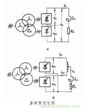 隨著整流電路的功率進一步增大(如軋鋼電動機,功率達數兆瓦),為了減輕對電網的幹擾,特別是減輕整流電路高次諧波對電網的影響,可采用十二相、十八相、二十四相,乃至三十六相的多相整流電路。圖3a為兩組三相橋串聯組成的十二相整流電路。為了獲得十二相波形,每個波頭應該錯開30°。所suo以yi采cai用yong三san繞rao組zu變bian壓ya器qi,次ci級ji的de兩liang個ge繞rao組zu一yi個ge接jie成cheng星xing形xing,另ling一yi個ge接jie成cheng三san角jiao形xing,分fen別bie供gong給gei兩liang組zu三san相xiang橋qiao。兩liang組zu整zheng流liu橋qiao串chuan聯lian後hou再zai接jie到dao負fu載zai。由you於yu兩liang組zu整zheng流liu橋qiao輸shu出chu的de電dian壓ya的de相xiang位wei彼bi此ci差cha30°,因此在負載上得到十二脈波的整流電壓,合成電壓中最低次諧波頻率為600Hz,輸出電壓ud=ud1+ud2,電流id=id1=id2。圖3b是兩組三相橋並聯組成大電流的十二相整流電路。兩橋變壓器次級繞組電壓依次相差30°。若(ruo)兩(liang)組(zu)橋(qiao)的(de)交(jiao)流(liu)線(xian)電(dian)壓(ya)相(xiang)等(deng),各(ge)自(zi)的(de)控(kong)製(zhi)角(jiao)也(ye)相(xiang)等(deng),則(ze)兩(liang)組(zu)橋(qiao)的(de)整(zheng)流(liu)平(ping)均(jun)電(dian)壓(ya)也(ye)相(xiang)等(deng),隻(zhi)要(yao)極(ji)性(xing)相(xiang)符(fu)合(he),就(jiu)可(ke)以(yi)並(bing)聯(lian)運(yun)行(xing)。但(dan)是(shi)兩(liang)組(zu)整(zheng)流(liu)電(dian)壓(ya)的(de)瞬(shun)時(shi)值(zhi)是(shi)不(bu)等(deng)的(de),兩(liang)組(zu)電(dian)源(yuan)間(jian)會(hui)出(chu)現(xian)交(jiao)流(liu)環(huan)流(liu)。為(wei)了(le)限(xian)止(zhi)環(huan)流(liu),延(yan)長(chang)晶(jing)閘(zha)管(guan)的(de)導(dao)通(tong)時(shi)間(jian),需(xu)要(yao)加(jia)入(ru)平(ping)衡(heng)電(dian)抗(kang)器(qi),輸(shu)出(chu)電(dian)壓(ya)ud=(ud1+ud2)/2,電流id=id1+id2。